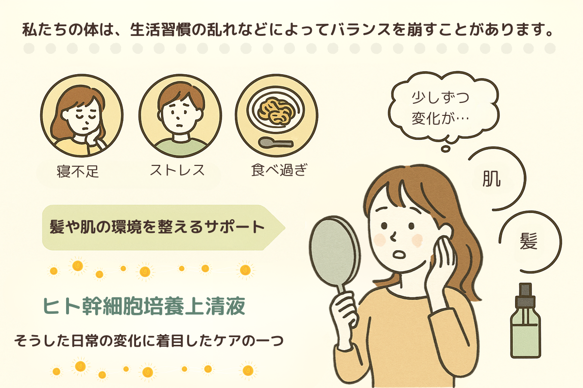 ヒト幹細胞培養上清液は、そうした日常の変化に着目したケアの一つで、髪や肌の環境を整えるサポートが期待されている成分といわれています。