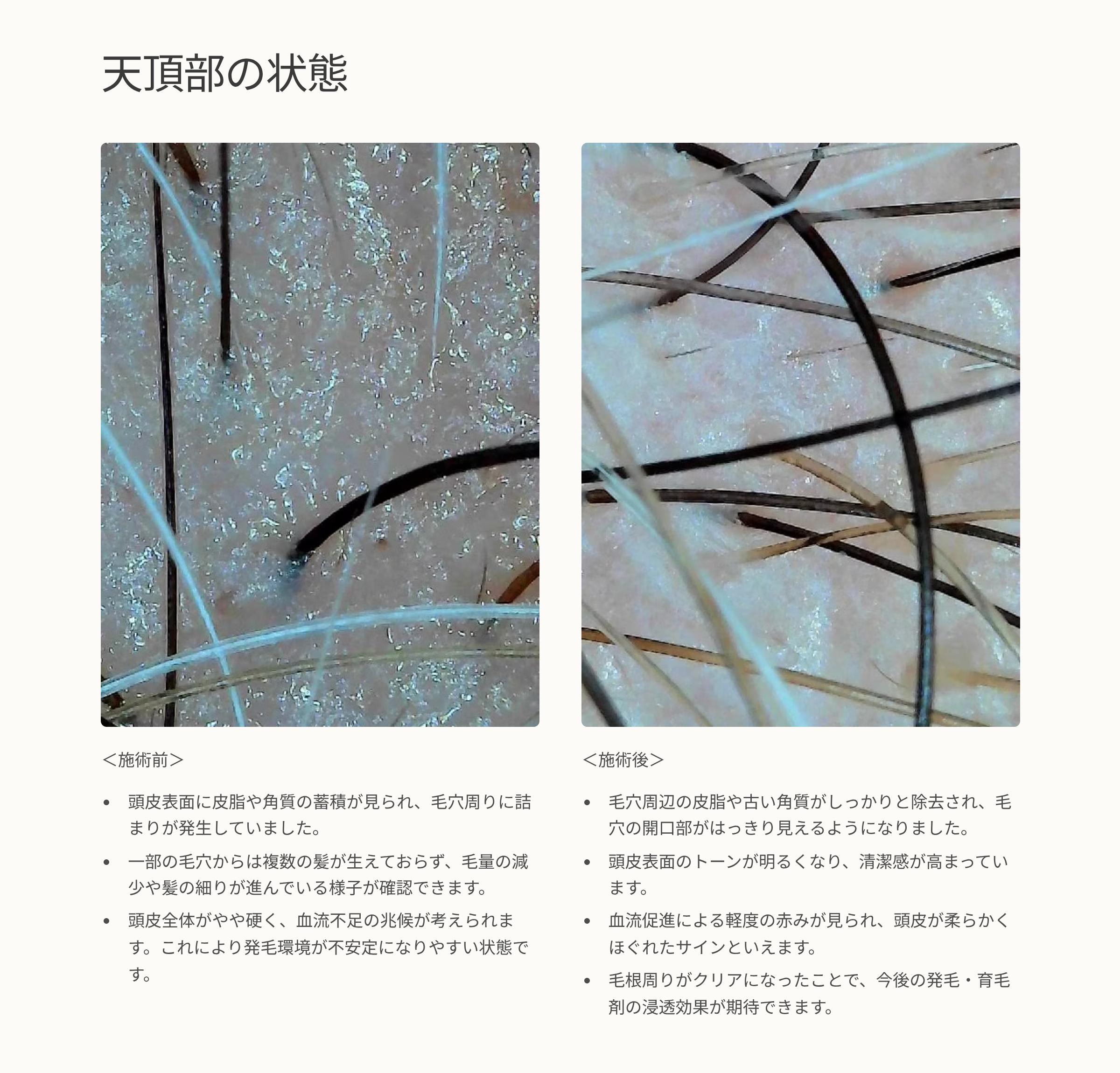 施術前のマイクロスコープ画像では、皮脂や古い角質が毛根をふさぎ、髪の成長を妨げていました。ところが、サロンでの頭皮ケアを1回行った後の状態は大きく変化。