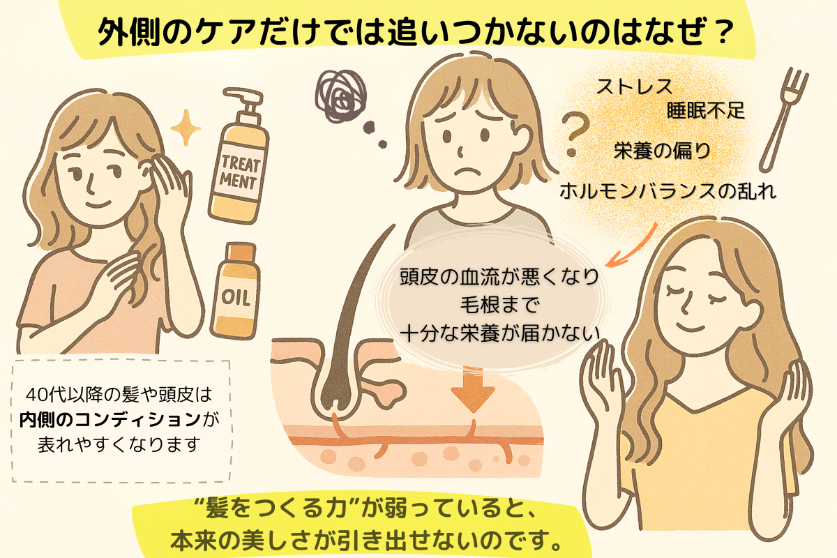 けれど40代以降の髪や頭皮は、内側のコンディションがそのまま表面に表れやすくなります。