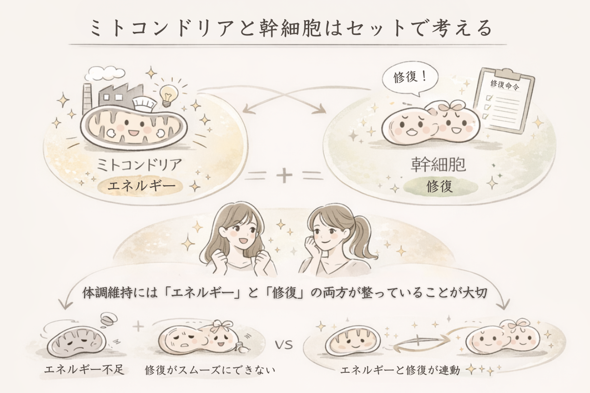 ミトコンドリアが元気でエネルギーが十分にある状態では、幹細胞の修復指令もスムーズに働きやすくなります。